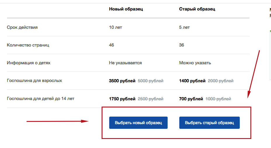 Открывается страница описания образца загранпаспорта со сравнением различий. Заявителю необходимо нажать на один из вариантов: «Выбрать новый образец» или «Выбрать старый образец».