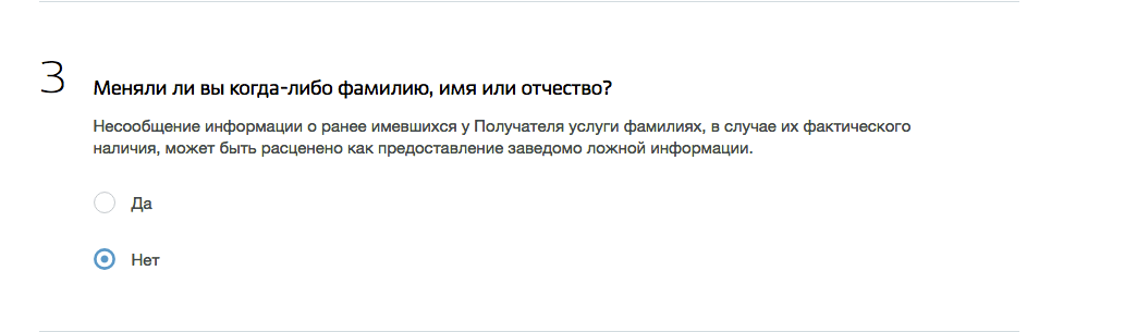Шаг третий. Надо будет ответить на вопрос о смене фамилии. То есть производилась эта операция или нет.