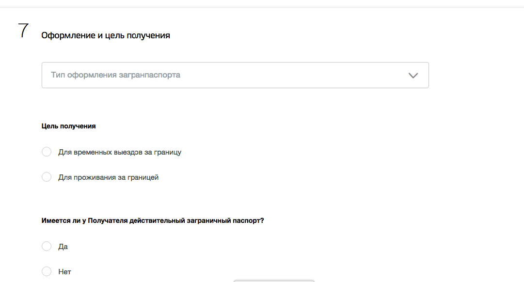 Шаг седьмой. Указывается тип оформления (замена, дополнение или первичное). Вписывается цель, для которой предполагается использовать загранпаспорт. Здесь же размещается ответ на вопрос о наличии заграничного паспорта.