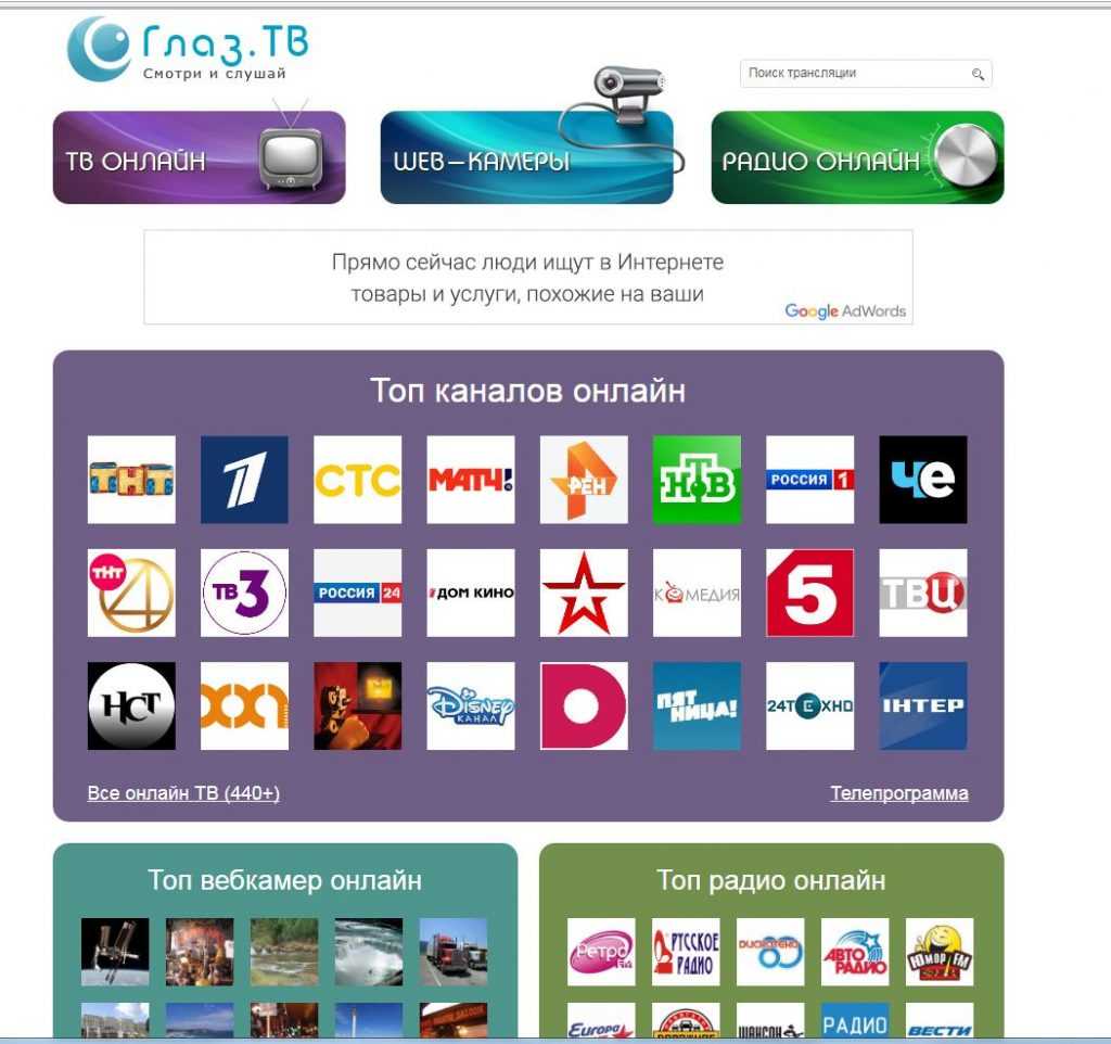 Пожалуй, Glaz.tv — один из самых полных и удобных сайтов для просмотра прямого эфира ТВ в Интернете. Помимо непосредственно телевидения, на сайте предлагается сборник онлайн-вебкамер, а также прослушивание популярных FM радиостанций.