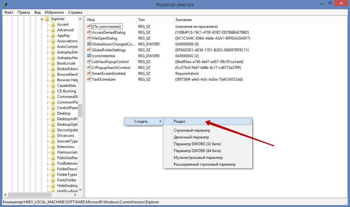 Если в разделе Explorer отсутствует Shell Icons, то создайте такой раздел, кликнув по Explorer правой кнопкой мыши и выбрав пункты «Создать» — «Раздел». После этого установите имя раздела — Shell Icons.