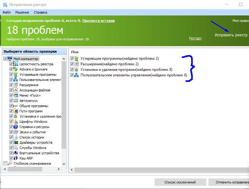 Программа так же предоставляет замечательную возможность очистить компьютер от мусора. Мусор «образуется» в системе при ее работе. Это «остатки» удаленных программ, ненужные Вам временные файлы, неправильные ссылки и так далее. Сейчас мы их удалим. Идем в следующий «инструмент» — «Исправление реестра»:
