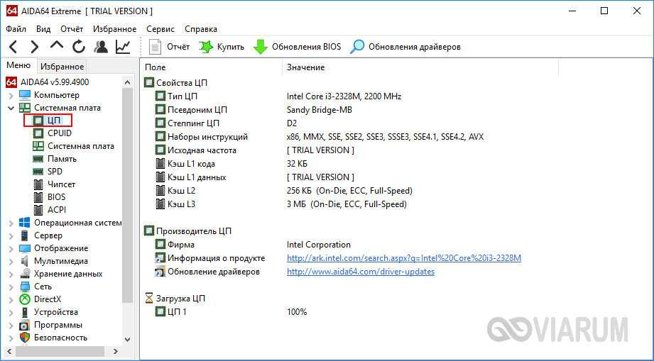Наиболее мощный программный продукт для получения сведений о конфигурации компьютера. Поддерживает массу дополнительных функций, среди которых доступно тестирование диска, монитора, оперативной памяти и графической карты. Чтобы посмотреть данные о процессоре, в меню слева нужно раскрыть пункт «Системная плата – ЦП».