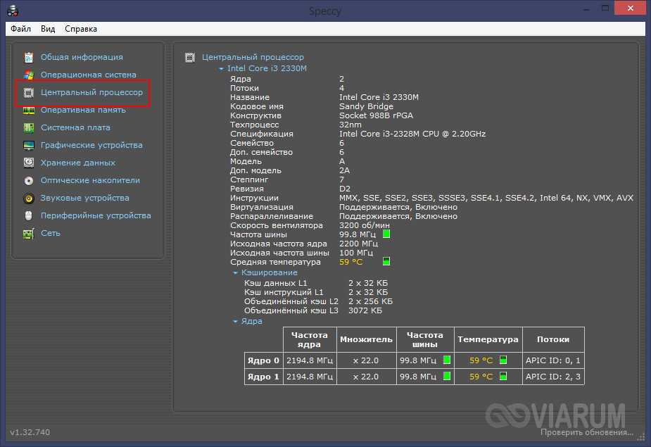 Бесплатная утилита для получения сведений о конфигурации ПК от разработчиков популярного чистильщика CCleaner. С ее помощью можно узнать название и кодовое имя процессора, его конструктив, модель, инструкции, частоту шины, а также посмотреть сколько ядер имеется на компьютере Windows 7/10. Speccy также отображает данные о потоках, температуре, множителях, процессорном кэше, скорости кулеров и прочие еще более специфические сведения. Все эти показатели находятся в разделе «Центральный процессор».