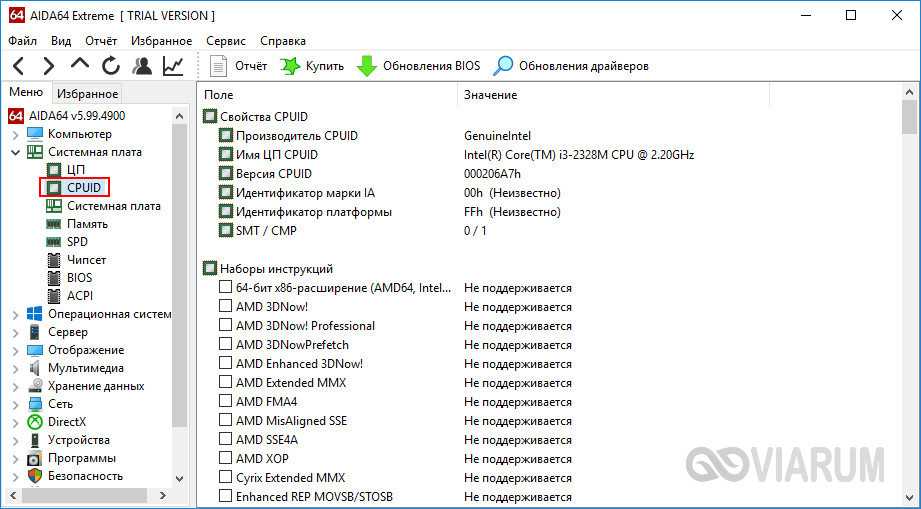 Здесь будут указаны наименование и псевдоним процессора, тактовая частота, наборы инструкций, количество ядер, данные кэша (в триал-версии недоступны), степпинг и т.д. Дополнительные сведения можно получить в подразделе «CPUID».