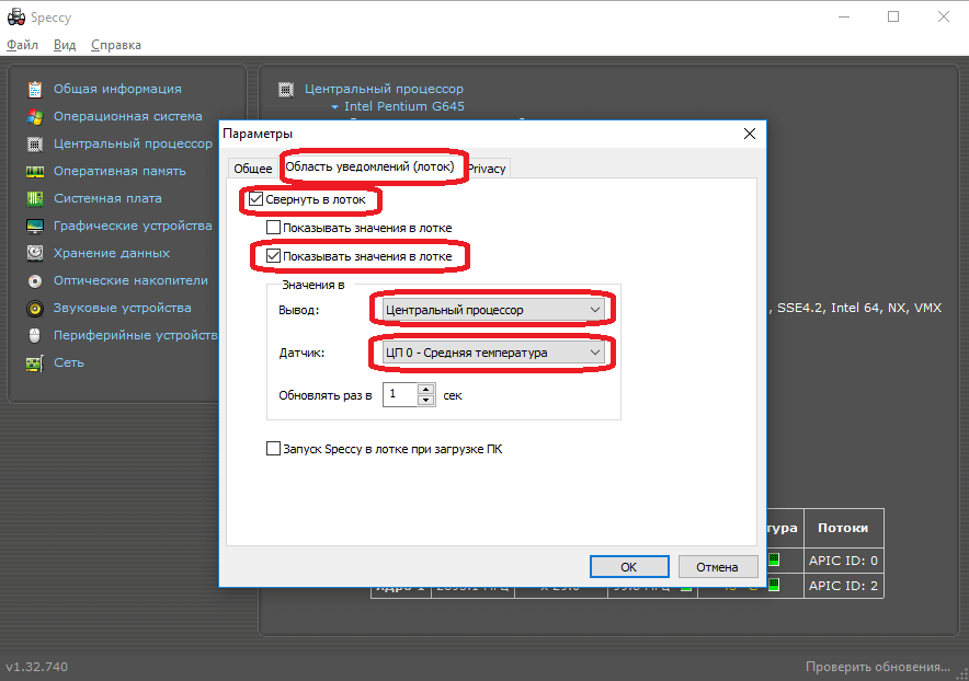 Программа Speccy также предоставляет возможность просмотра температуры процессора (и не только) в трее. Для этого нужно включить соответствующую функцию в настройках программы.