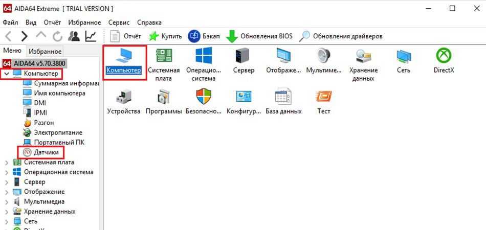 - После запуска утилиты перейдите в раздел «Компьютер» в левой части окна, затем откройте подраздел «Датчики».