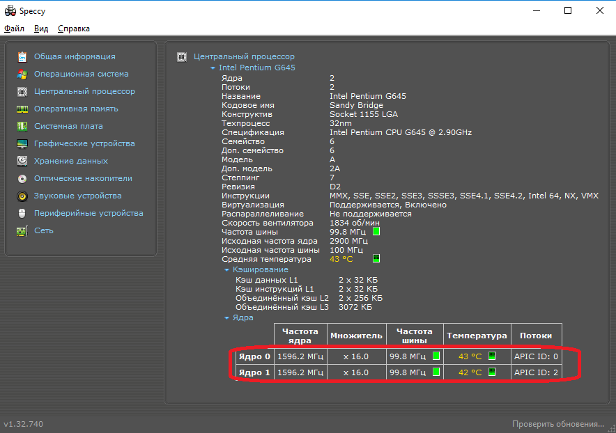 Если кликнуть по названию раздела «Центральный процессор», то на экране отобразится более подробная информация о ЦП, где также можно будет уточнить температуру нагрева ядер ЦП по отдельности: