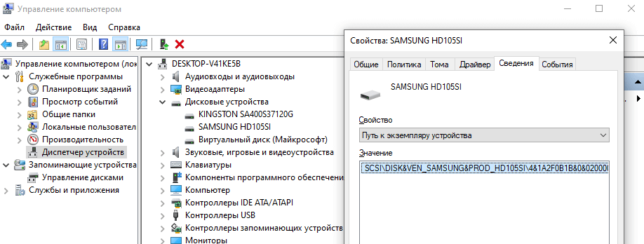 В контекстном меню кнопки Пуск выберите Диспетчер устройств. Теперь в разделе Дисковые устройства перейдите в Свойства подключённого диска. Переходим в закладку Сведения и в списке указываем свойство Путь к экземпляру устройства.