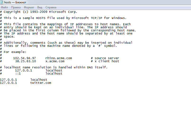 Рис. 3. Внесение адреса twitter.com в текст файла hosts.