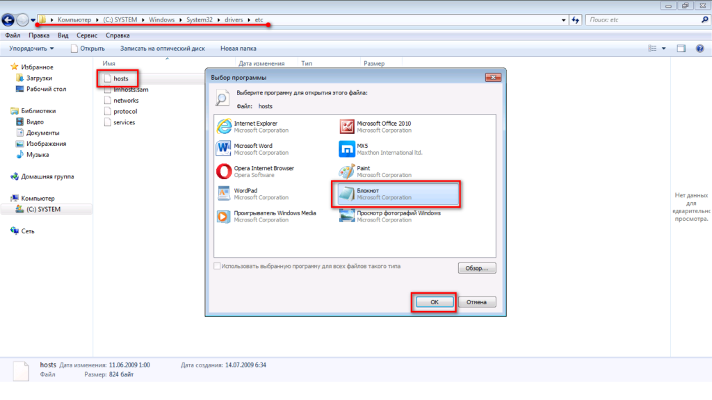 - Отредактировать файл hosts, который находится в папке C:\Windows\System32\drivers\etc. Открыть его можно с помощью стандартной программы «Блокнот». В этот файл дописываются адреса сайтов, которые нужно заблокировать. После сохранения изменений и перезагрузки компьютера эти сайты загружаться не будут.