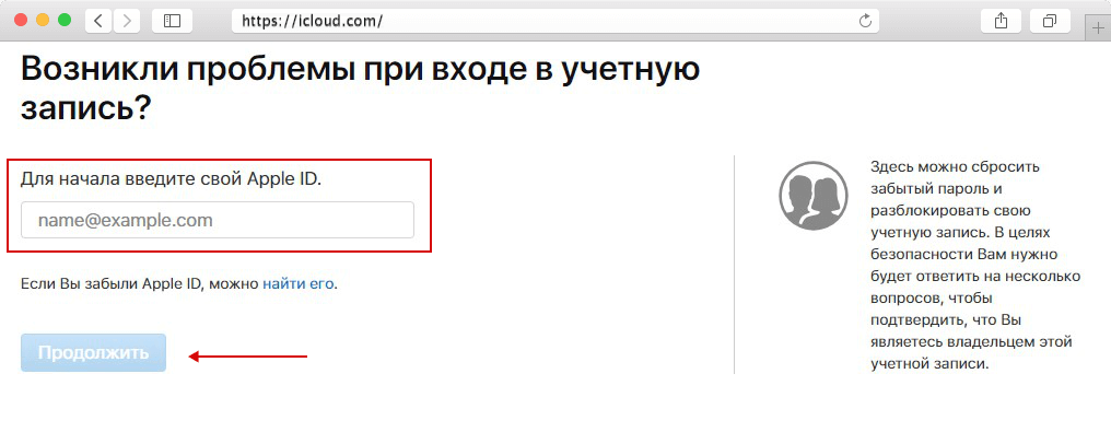 После этого вы перейдете на страницу Восстановления пароля от Apple ID. В открывшемся окне введите свой электронный адрес и нажмите продолжить: