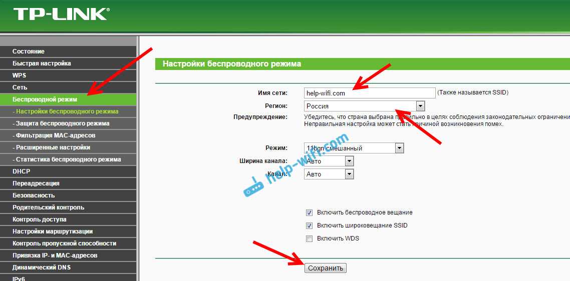 Здесь нам нужно сменить название Wi-Fi сети, выбрать наш регион, и нажать на кнопку Сохранить.