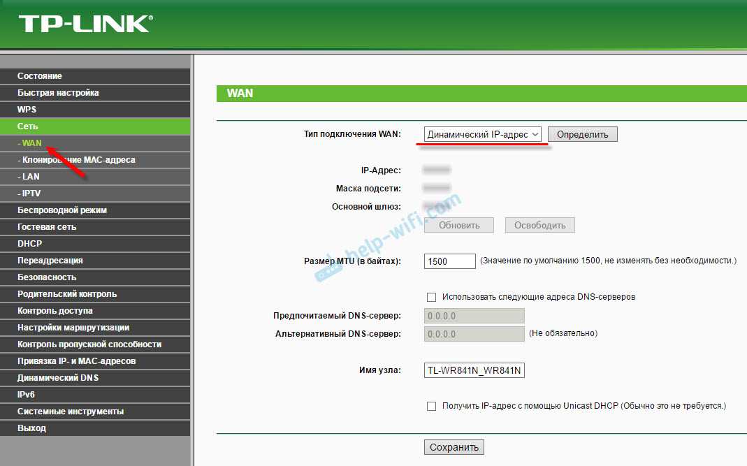 Если доступ к сети интернет провайдер предлагает посредством динамического подключения (когда он выдаёт все необходимое сам), в строке «Тип подключения WAN» выбирается «Динамический IP-адрес» и страница принимает следующий вид: