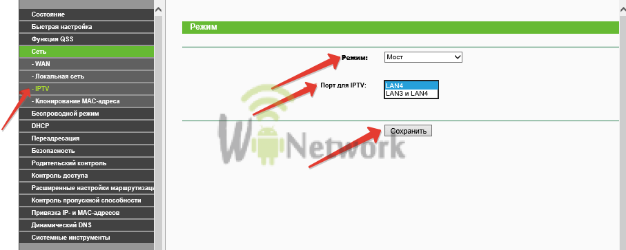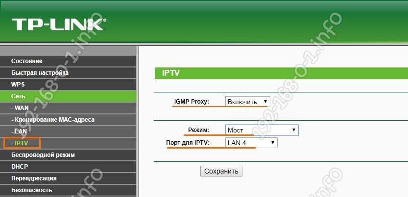 Активируйте режим «IGMP Proxy». Ниже, в поле «Режим» поставьте значение «Мост» и выберите порт для IPTV — «LAN4». Нажимите кнопку «Сохранить». Теперь надо подключить ТВ-приставку к TL-WR740N и проверить работу услуги.