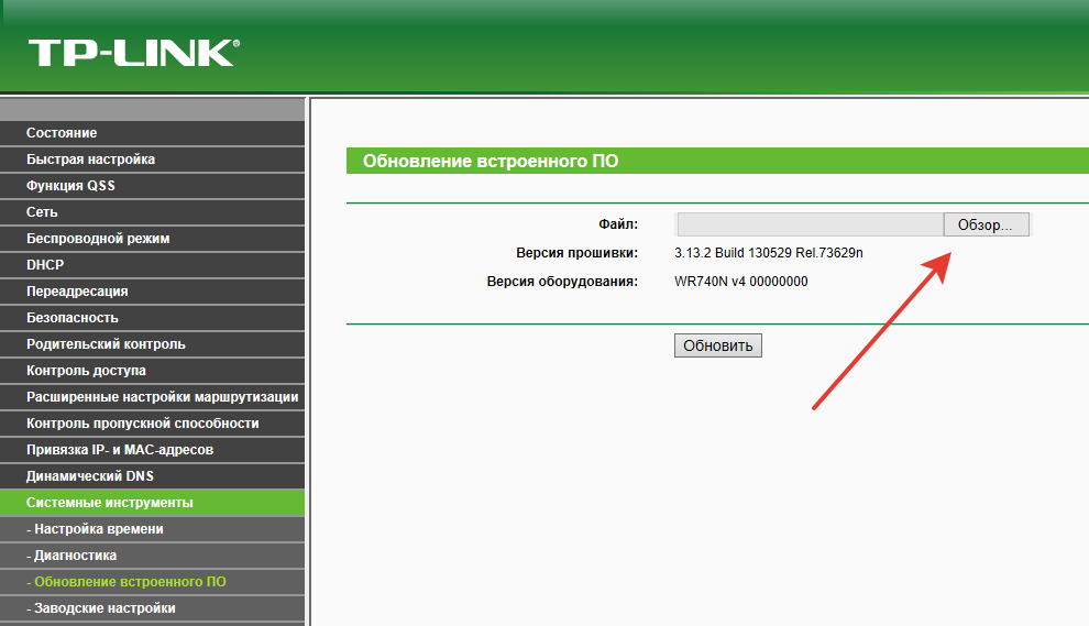 Для перепрошивки зайдите в главное меню вашего роутера и найдите там пункт «Системные инструменты», подпункт «Обновление встроенного ПО». Дальше всё просто — жмём «Выберите файл» и выбираем предварительно разархивированный файл прошивки. После чего нажимаем кнопку «Обновить». На экране появится шкала прогресса. Когда она дойдёт до 100%, роутер перезагрузится.