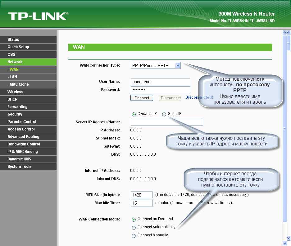 Итак, настройка роутера tp link tl wr741nd тип PPTP с VPN серверам: