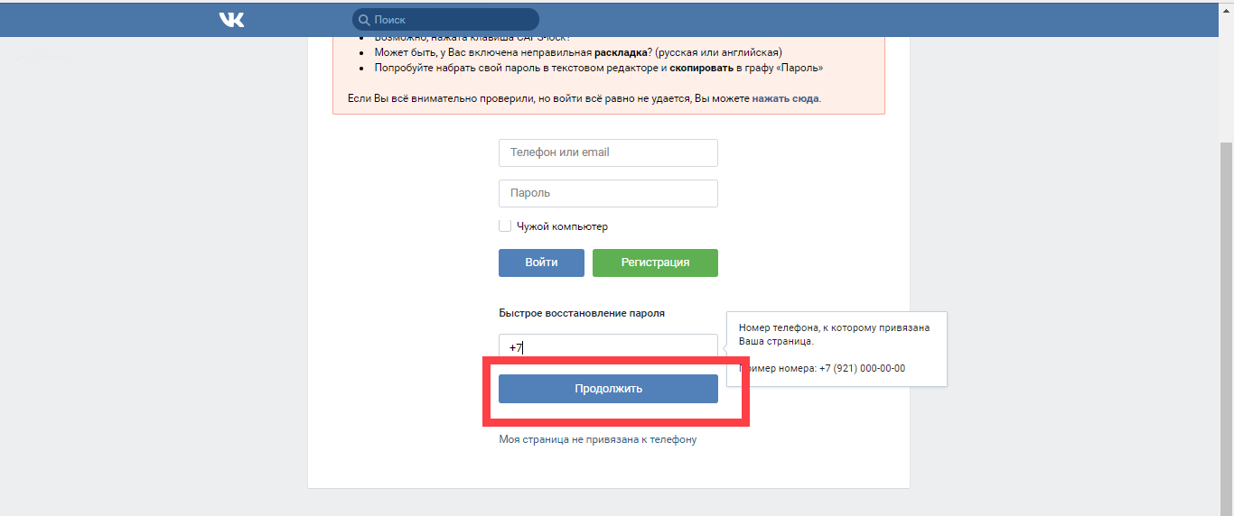 - В этом случае, после нажатия кнопки запроса на восстановление пароля, на обновившейся странице найдите ссылку Моя страница не привязана к номеру телефона;