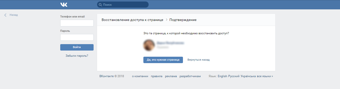 - Появится страница и вопрос – та ли это страница, к которой нужно восстановить доступ, выберите Да или Нет, соответственно;