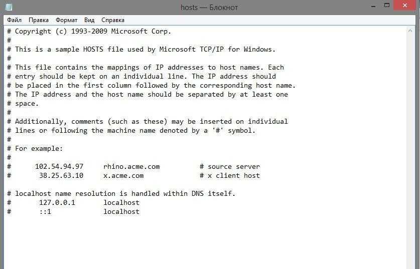 Открыв файл, убедитесь, что в нем лишних строчек, кроме «127.0.0.1 localhost» (без кавычек), если такие присутствуют, например «131.179.113.143 vk.com», то незамедлительно удалите их и сохраните файл.