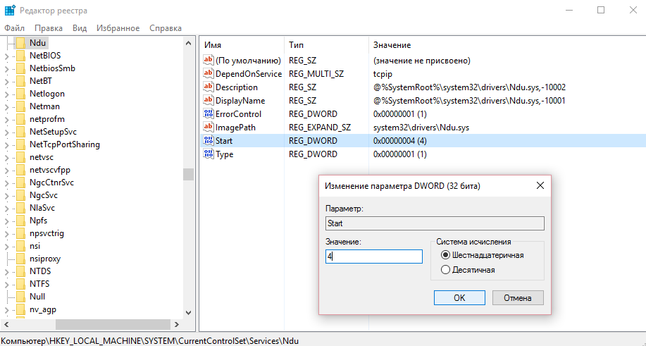 - Перейдите к разделу HKEY_LOCAL_MACHINE\ SYSTEM\ ControlSet001\ Services\ Ndu\