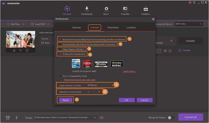 7. Кликните Сбросить в нижнем левом углу, чтобы сбросить все параметры конвертации и сделать их по умолчанию. Кликните OK, чтобы сохранить параметры.