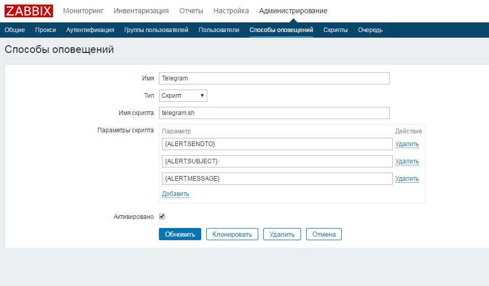 Напишем очень простой скрипт, который будет использовать zabbix для отправки оповещений в telegram. Стандартная настройка для директории со скриптами, которые использует заббикс для отправки уведомлений — /usr/lib/zabbix/alertscripts. Поменять ее можно в параметре AlertScriptsPath. Создадим скрипт.