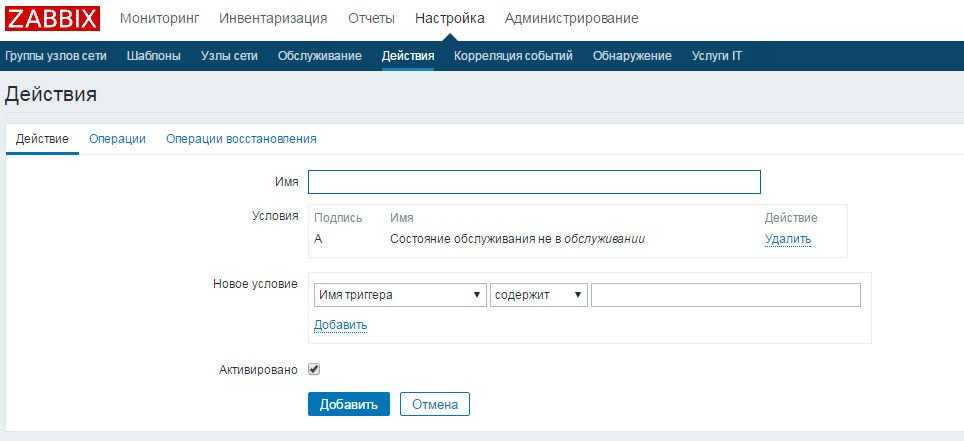 Теперь нам необходимо создать так называемое “Действие”, которое при определенных условиях будет использовать наш способ оповещения. Для этого нам нужно перейти на вкладку “Настройка” и в появившейся строке нажать на кнопку “Действия”, как показано на скриншоте ниже.