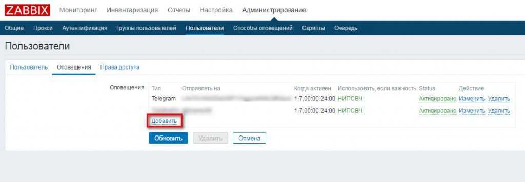 После этого у пользователя в Оповещениях появится новый способ оповещения. Нажимаем «Обновить«.