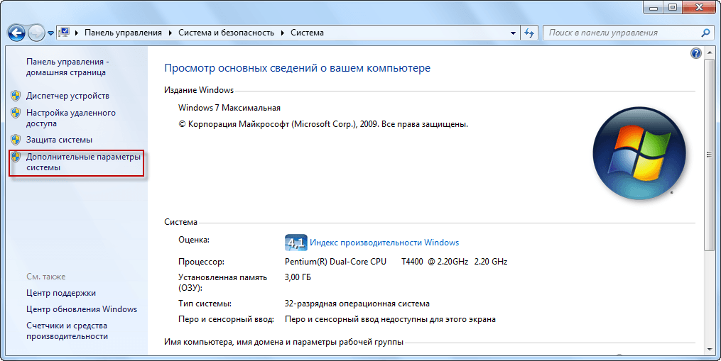 Заходим в панель управления (через меню «Пуск») и находим раздел «Системы и безопасности», открываем его. И теперь открываем пункт «Система». В левой части окошка находится ссылка «Дополнительные параметры системы», переходим по ней.