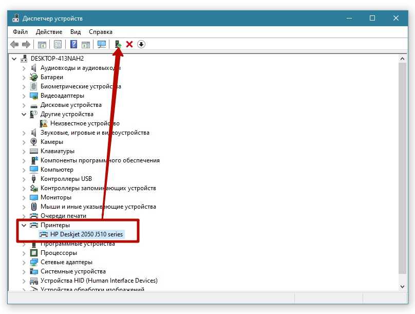 Если его нет в соответствующей вкладке (он может находиться во вкладке устройства или другие устройства), а в диспетчере задач в пункте Принтеры на иконке устройства есть желтый треугольник с восклицательным знаком, значит произошел сбой драйвера и из-за этого принтер перестал печатать — потребуется переустановка драйвера.