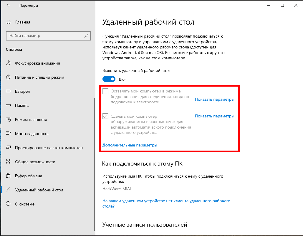 На вкладке «Удалённый рабочий стол» включите соответствующий ползунок. Также вы можете выбрать пользователей, которые могут подключаться удалённо к компьютеру.