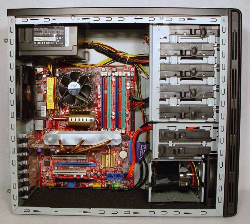 Системный блок содержит в себе материнскую плату с процессором и памятью, блок питания, видеокарту (отдельную или интегрированную), сетевой адаптер для коммуникации с внешним миром (отдельный или интегрированный в материнскую плату), привод DVD или Blue-ray (не обязательно), жесткий диск (электромеханический или твердотельный – SSD).