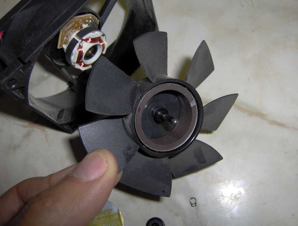 Если удастся отковырнуть крыльчатку, можно смазать втулку с подшипником. В интернете на эту тему можно видеть целые дебаты на профильных форумах: чем смазывать, почему не годится обычное машинное масло и т. п. Не подходят густые и жидкие смазки — первая будет препятствовать свободному вращению подшипника, второе просто вытечет.