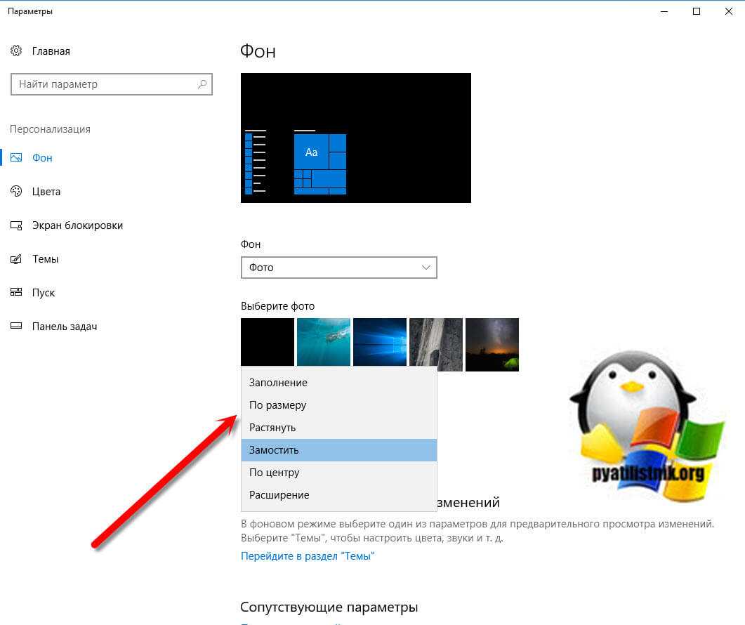 После применения растягивания картинки, на ноутбуках вышла ситуация, что на рабочем толе картинка размножилась и стала по центру, было очень не красиво и такое было только на ноутбуках, на компьютерах и терминалах все было хорошо. Например в Windows 10 параметров персонализации куда больше: