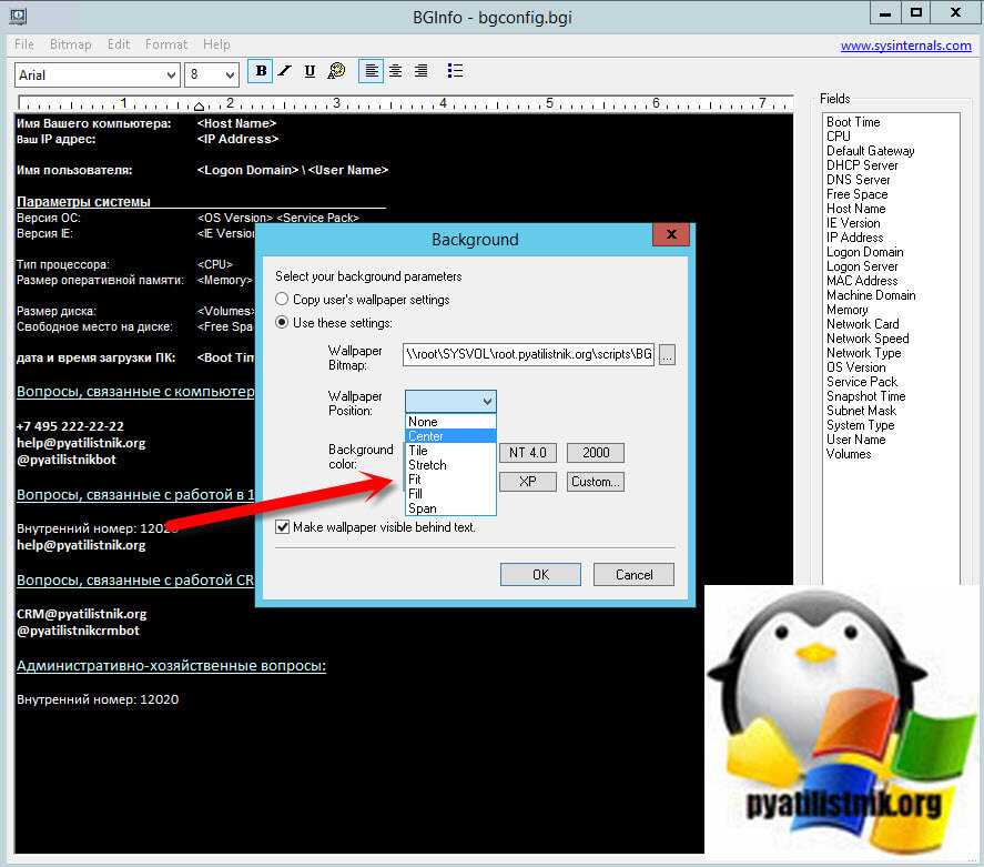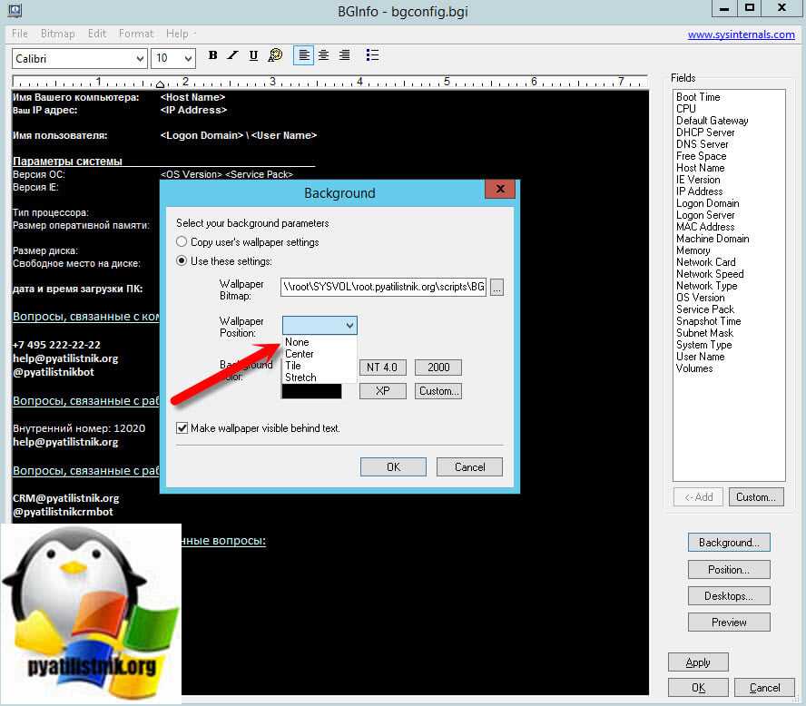 Я через новую политику GPO сделал, так чтобы этот ключ добавлялся при входе пользователя, и чтобы вы думали, оно не работало. Всему этому причина, что BGinfo выполняется позже и пере затирает настройки расположения картинки. Но все решилось, тем что я скачал новую версию BGinfo, где эти пункты уже были, я выбрал Fill. Так же убедитесь, что установлена галка «Make wallpaper visible behind text». включает видимость рисунка за текстом. Если отключить его, то текст будет показан на фоне указанного цвета в Background color. Сохраняем настройки.