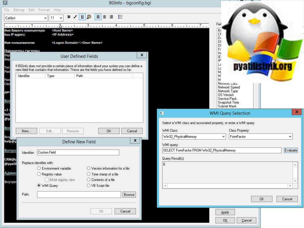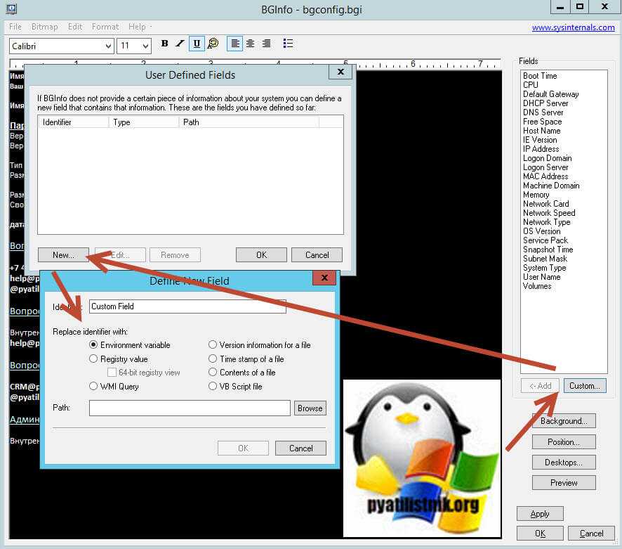 Используйте кнопку Custom, чтобы добавить специальную информацию, которую вы определяете сами. Вы сможете создавать пользовательские поля, которые отображают специальные данные, которые обычно недоступны, включая извлечение данных из реестра, переменных сред, WMI, файлов или даже сценария VB сценариев. Расширяя BGInfo таким образом, вы можете заставить его отображать абсолютно все, что вы хотели бы видеть на рабочем столе.