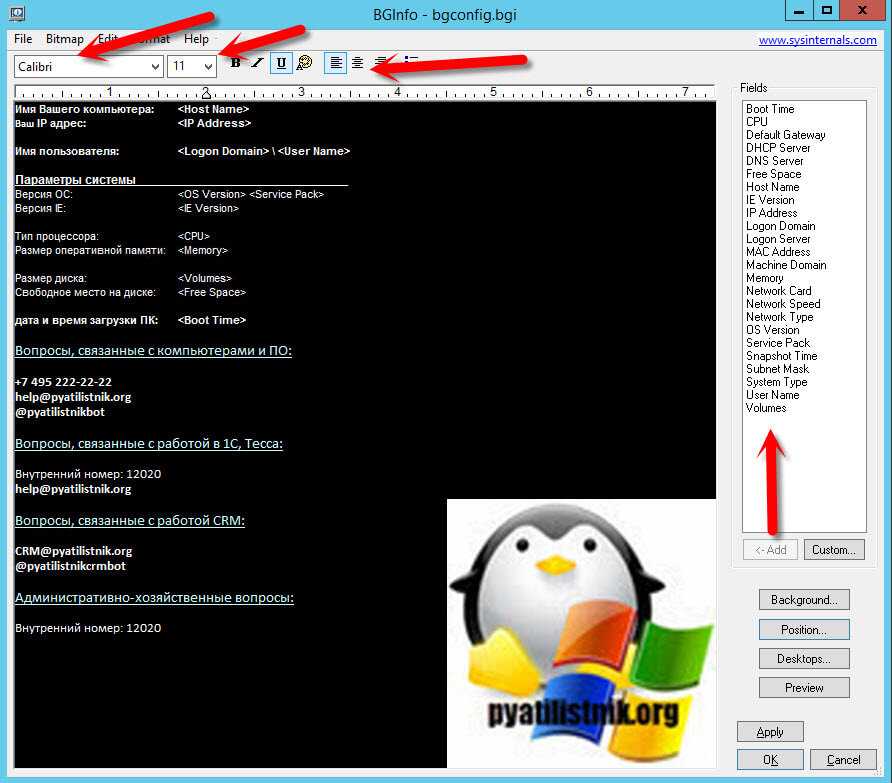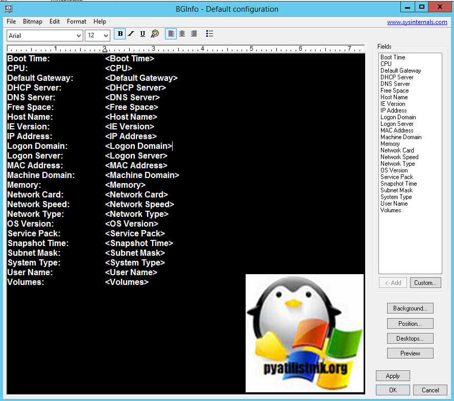 У вас откроется окно редактора BGInfo. По умолчанию в файле конфигурации будут прописаны все доступные параметры: