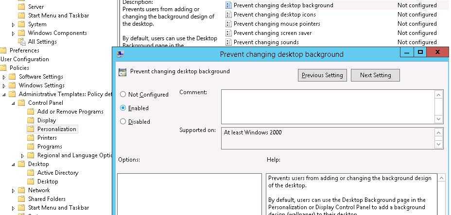 Если требуется запретить пользователям менять фоновый рисунок рабочего стола, включите политику Prevent Changing Desktop Background (Запрет изменения фона рабочего стола) в разделе User Configuration -> Administrative Templates -> Control Panel -> Personalization.