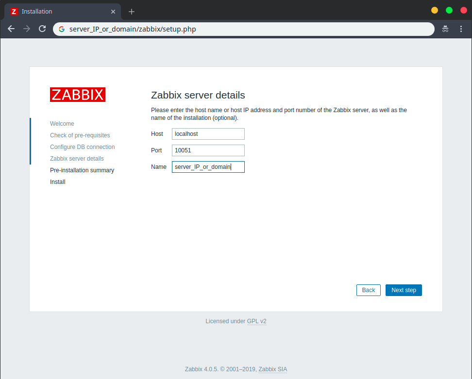Now type the Zabbix server name. In our case it was the IP of our server.