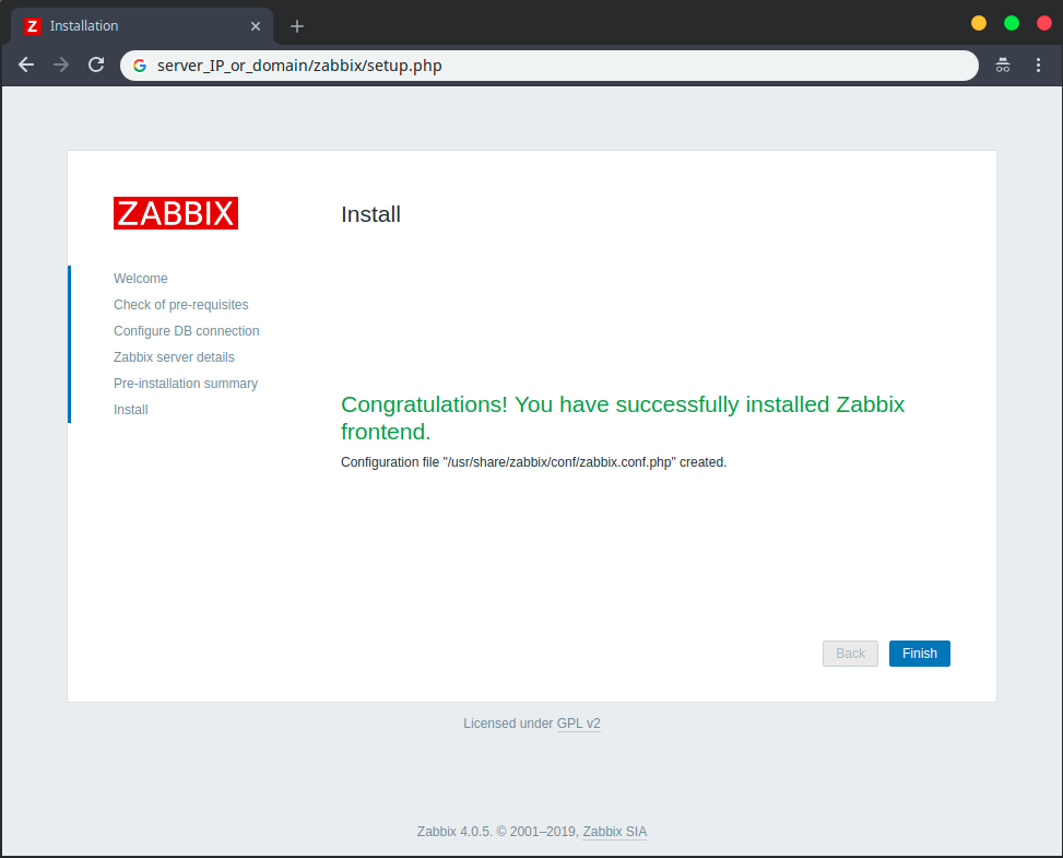 And we’re done with configuring Zabbix. We can now proceed to complete the install in the browser.