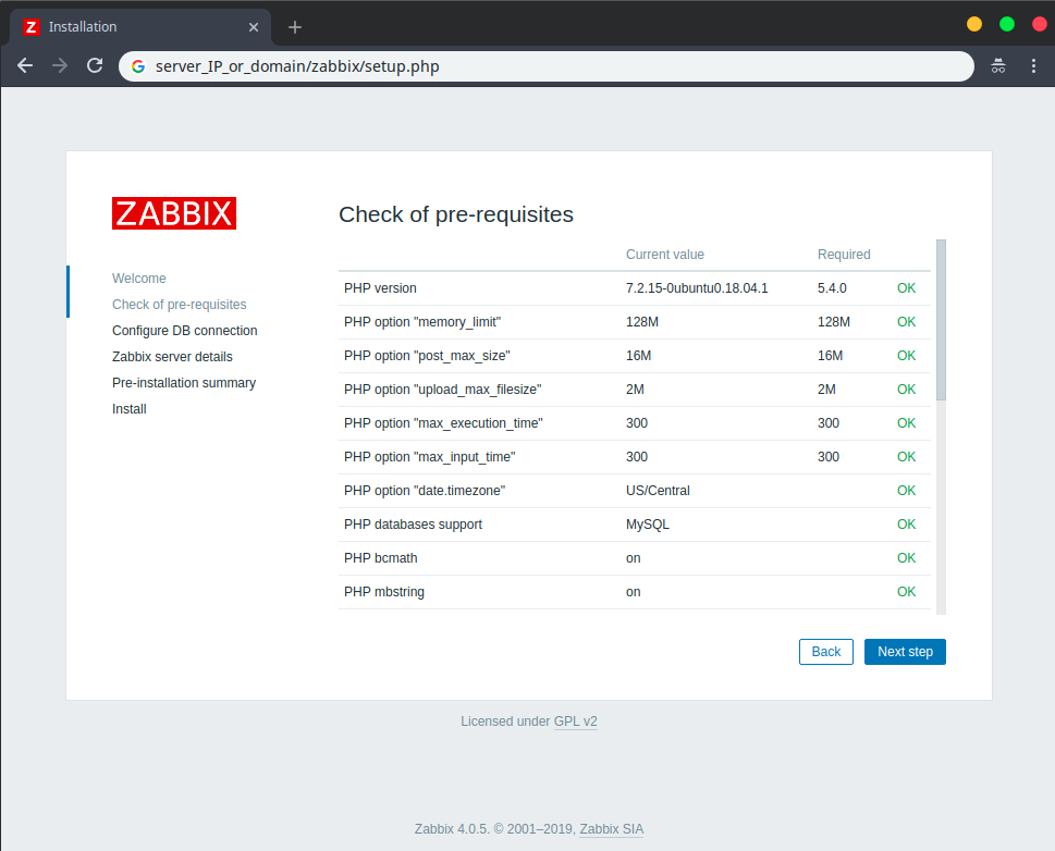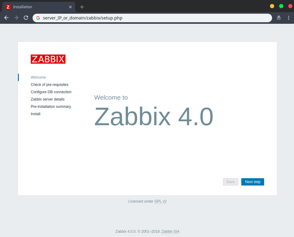 You’ll be greeted by the Zabbix setup page. You can click on to continue the setup.