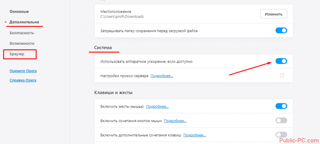 Заходим в настройки Оперы через меню, кликнув мышкой по иконке в левом верхнем углу, или с помощью клавиш Alt+P. В настройках нам нужен раздел «Дополнительно», вкладка «Браузер» и подраздел «Система». Там мы и отключаем ускорение, убрав маркер.