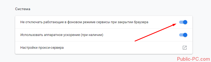 Внизу раскрываем дополнительные настройки и так же ищем раздел «Система». Убираем маркер с параметра аппаратного ускорения.