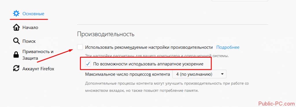 Нам нужен раздел «Основные». Пролистываем до подраздела «Производительность». Для начала снимаем маркер с «Использовать рекомендуемые настройки…». Появится строка с параметром аппаратного ускорения. Отключите его, убрав маркер.
