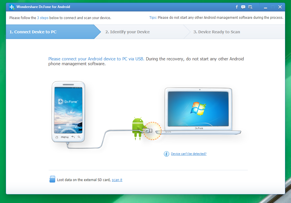 Dr Fone for Android – то, что нужно современным мобильным средствам, ведь она позволяет проводить процесс сканирования. Подключить можно к компьютеру с помощью обычного кабеля. Правда, нужно уточнить, что Dr Fone Android на сегодняшний день не поддерживает прочие способы подключения и, скорей всего, не будет этого делать и в будущем.