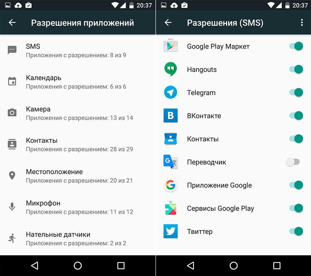 Начнем с пункта “Разрешения приложений”. В данном пункте мы определяем, какому приложению дать доступ к SMS, календарю, камере, контактам, местоположению, микрофону, нательным датчикам, памяти, телефону и другим функциям. Теперь при установке приложения из Google Play не нужно соглашаться на все условия одним махом. Все будет происходить постепенно. При первой попытке получить доступ к данным на устройстве будет осуществляться запрос и тогда уже можно либо разрешить, либо запретить.
