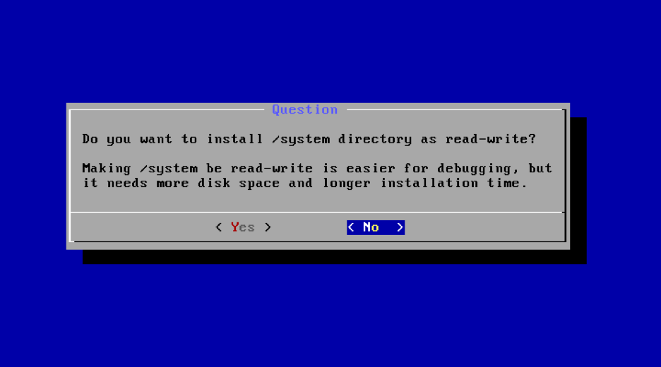 The installer will ask whether or not you want to make the system partition read/write-able. If you want to root your installation, you will choose «Yes» here. Otherwise, choose «No.»