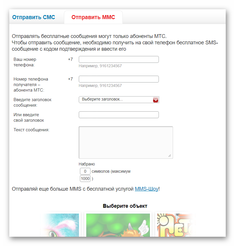 Помимо стандартных SMS, на сайте реализована возможность отправки MMS. Это также полностью бесплатно. Сообщения можно отправлять только на номера абонентов МТС.