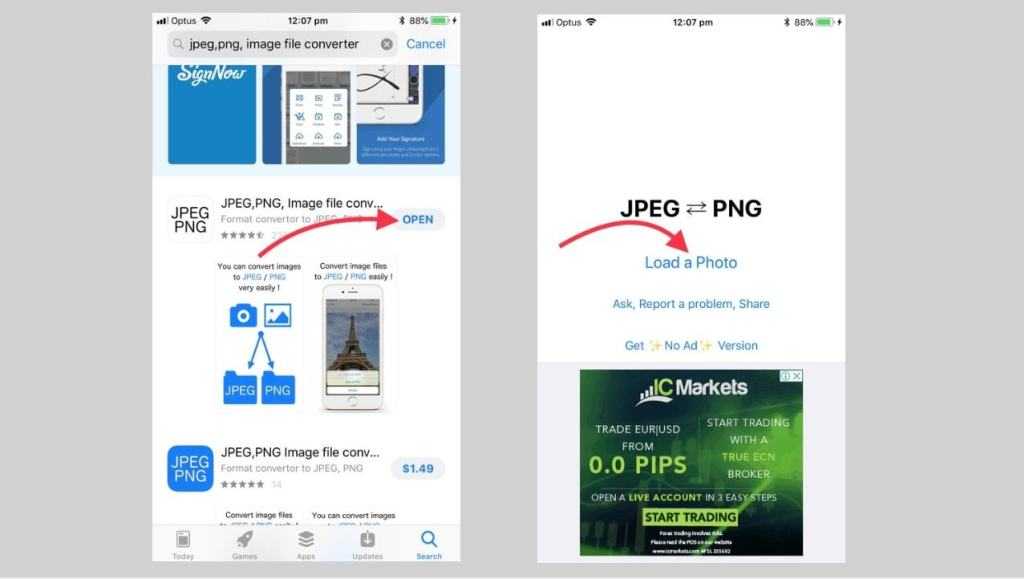 Одно из таких приложений – «JPEG, PNG, Image file converter». Это совершенно бесплатная программа, которую можно найти и скачать в магазине приложений iPhone. Кроме того, что приложение может преобразовывать файлы jpg в png и наоборот, оно обладает несколькими вариантами конвертации и может пригодиться вам в дальнейшем для того, чтобы конвертировать другие форматы изображений. Поддерживаемые форматы: JPEG, JPG, PNG, GIF, BMP, TIFF, TGA и HEIF. Для начала нужно установить приложение на ваше устройство. Найдите его в App Store и скачайте.
